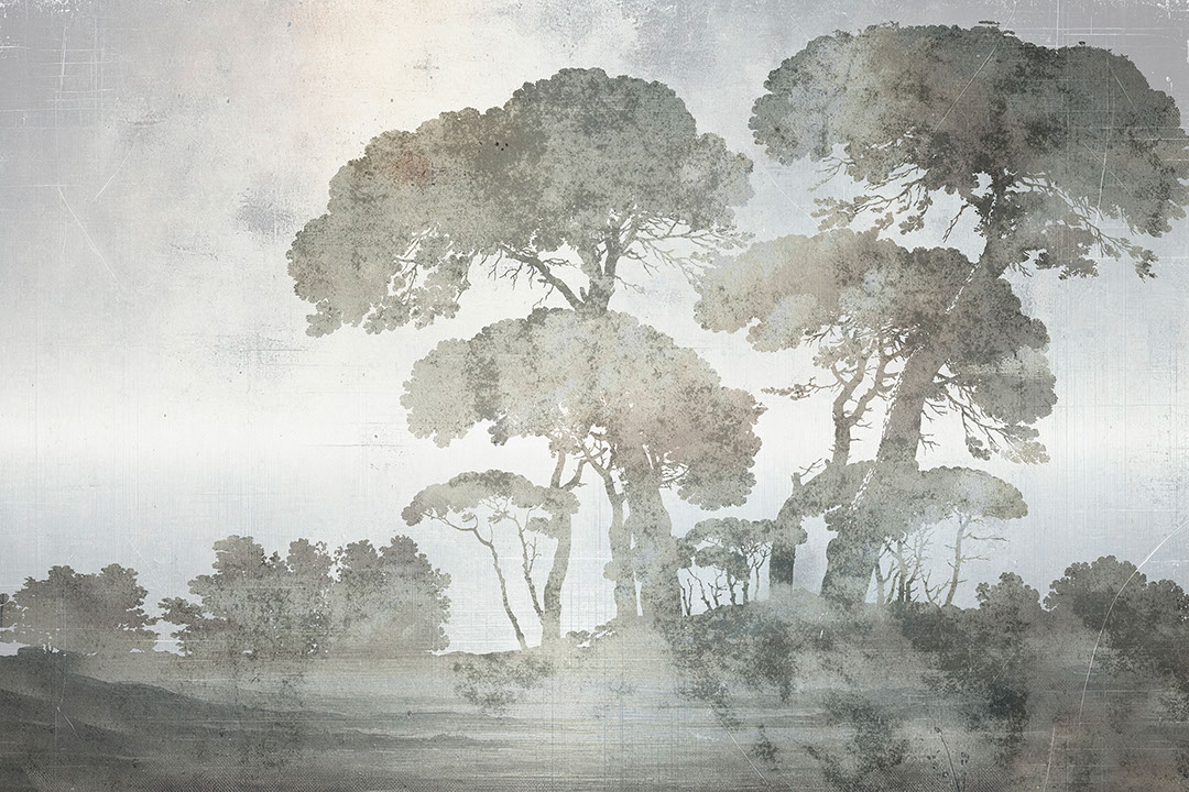 Carta da parati silhouette di pini in fredde tonalità grigie