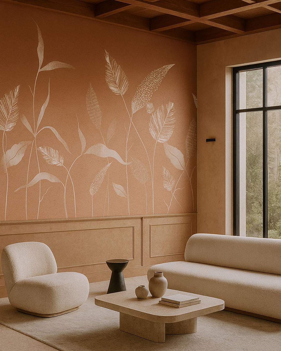 Terrena unisce silhouette grafiche di foglie a uno sfondo terracotta intenso, creando una parete di grande impatto ma accogliente. Il contrasto tra le forme chiare e la base profonda rende il motivo espressivo senza risultare eccessivo. Questa carta da parati è perfetta per cucine, sale da pranzo, studi creativi e spazi di lavoro artistici. Terrena si abbina molto bene alla ceramica, al legno e ai tessuti in tonalità naturali sabbia e crema. Il design porta creatività, ordine visivo e un calore terrigno all’ambiente.