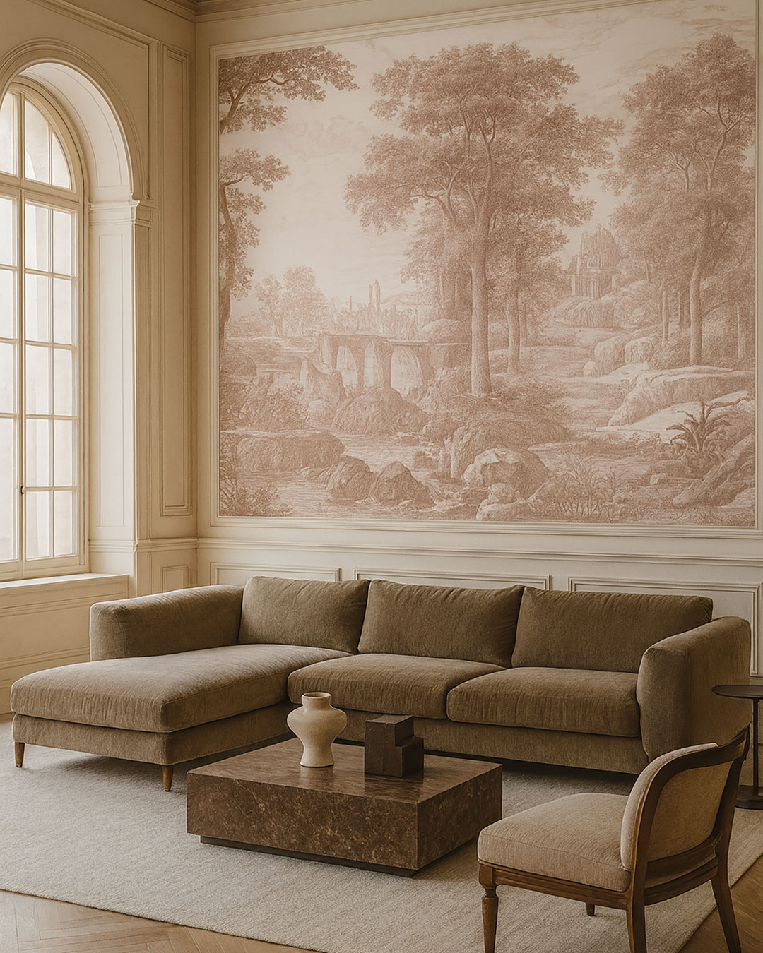 Rosaria richiama il fascino di un’antica incisione con un ponte, un fiume e una città lontana resi in morbidi toni rosa seppia. Gli alberi e l’architettura finemente disegnati portano nella stanza un senso di storia e un romanticismo discreto. Questa carta da parati è ideale per soggiorni, sale da pranzo o biblioteche domestiche che cercano un’atmosfera classica ed elegante. Rosaria si abbina molto bene al legno scuro o color miele, ai tessuti in lino e agli accenti color crema o rosa polvere. Con un’illuminazione calda e diffusa, il paesaggio crea un ambiente accogliente e meditativo. È una scelta raffinata per interni neoclassici, country francesi o eclettici dal gusto vintage.