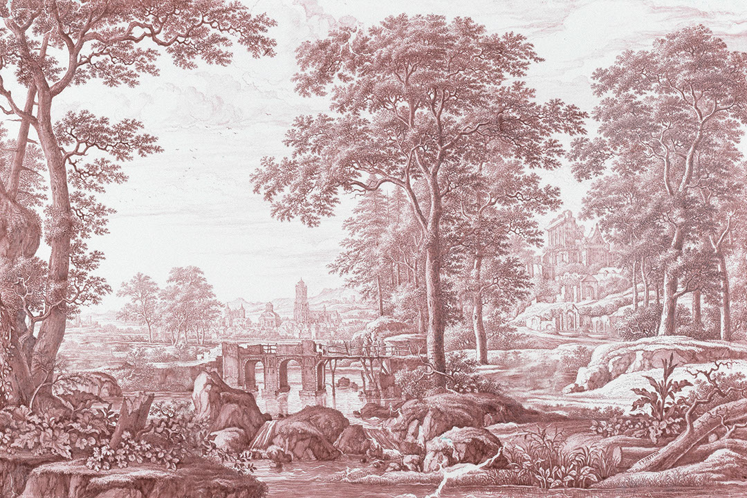 Carta da parati paesaggio inciso classico in calde tonalità rosa seppia