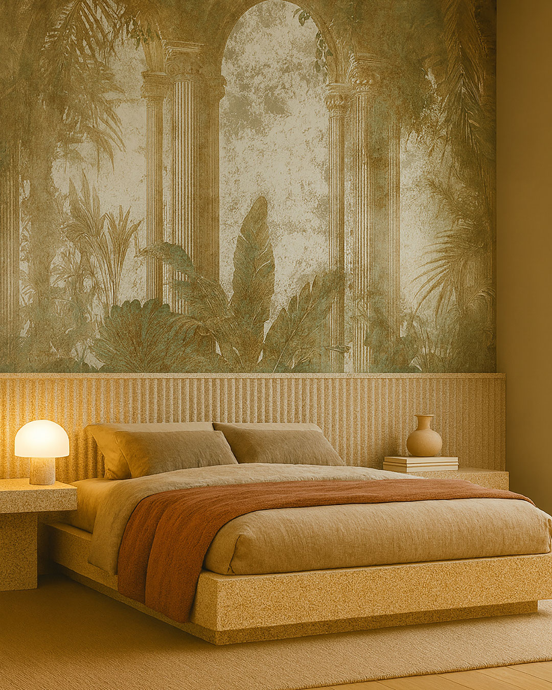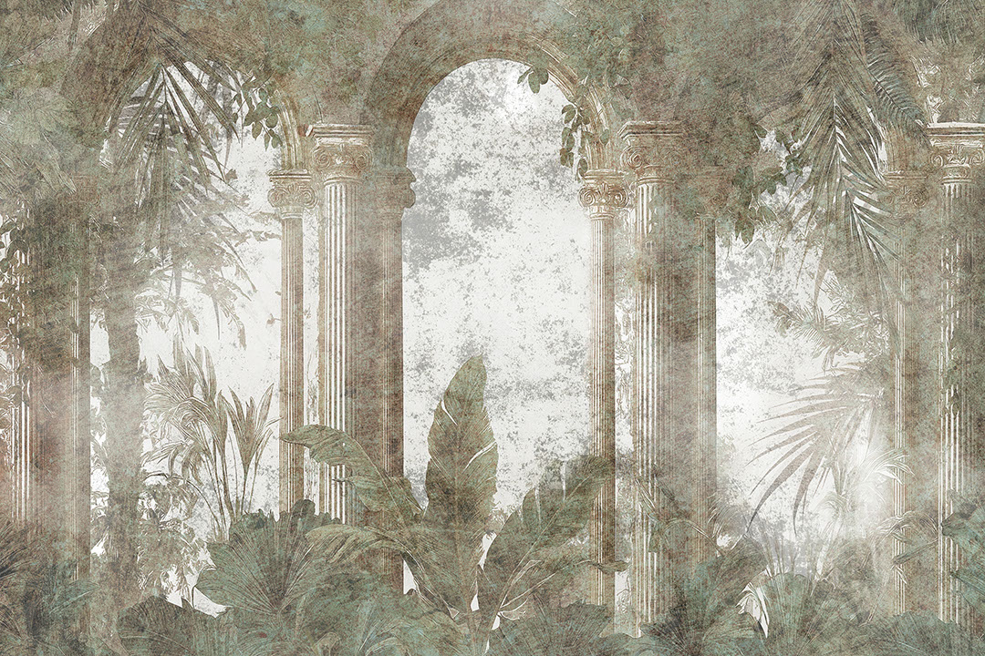 Arcadia ricorda le rovine tranquille di un antico giardino in cui vecchie colonne si perdono nel verde e nella delicata patina del tempo. La palette attenuata di muschio e sabbia crea uno sfondo morbido che dona profondità senza scurire l’ambiente. Questa carta da parati è ideale per soggiorni, camere da letto, sale degustazione o suite di boutique hotel che cercano un’atmosfera di fuga. Arcadia si abbina molto bene al legno naturale, ai dettagli in rattan, alla ceramica e ai tessuti nei toni dell’ oliva, del beige e del grigio caldo. Negli spazi ampi può diventare una parete protagonista, mentre negli ambienti più piccoli avvolge lo spazio in una panoramica soffice e immersiva. Il design esprime amore per la natura e la storia con un’elegante impronta vissuta.