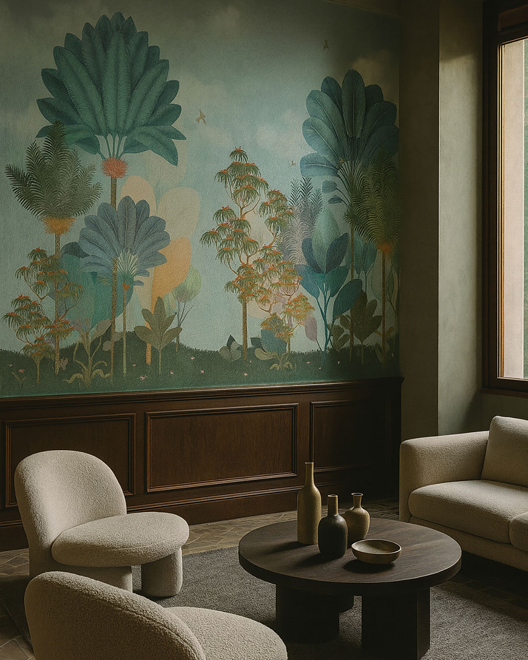 Celestia apre su un giardino fantastico in cui palme e alberi stilizzati nei toni del turchese, del blu e di caldi accenti si slanciano verso un cielo chiaro. Nuvole soffici e piccoli uccelli aggiungono leggerezza e gioia alla scena. Questa carta da parati è perfetta per camerette, zone gioco, studi creativi o soggiorni di famiglia rilassati. Celestia si abbina molto bene a pareti bianche o grigio chiaro, mobili in legno chiaro e tessuti nei toni della menta, del corallo e della lavanda tenue. Insieme ad arredi semplici e forme arrotondate nel décor crea un ambiente accogliente e sognante. Il design invita all’immaginazione e al gioco, rimanendo comunque delicato per l’uso quotidiano.