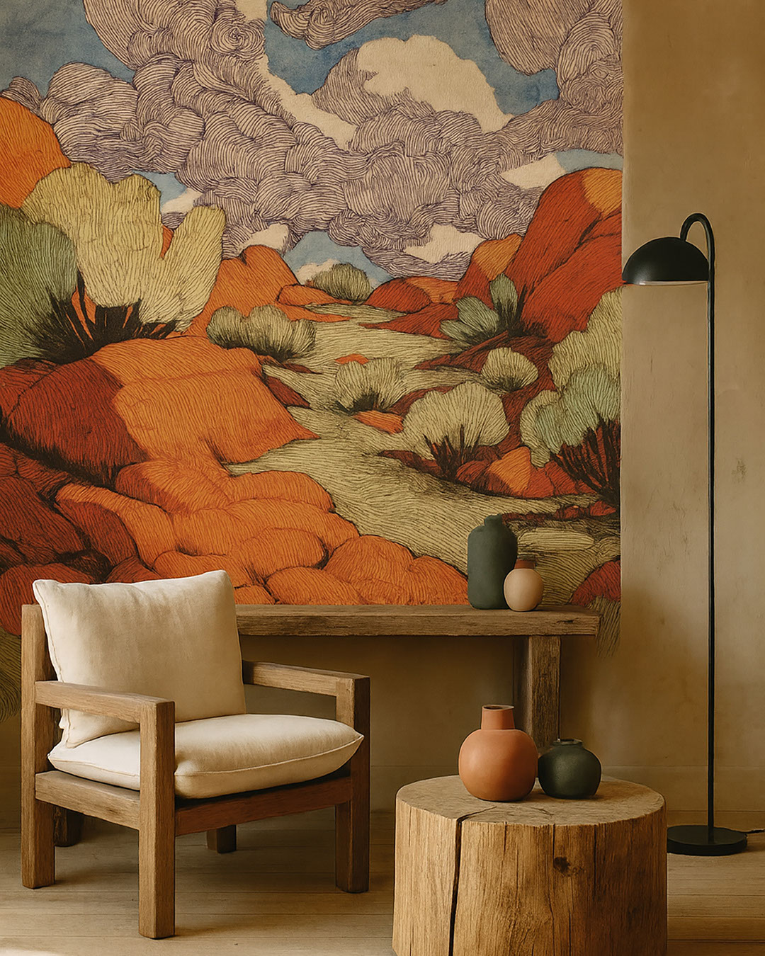 Sierra immerge in un vivace paesaggio desertico con rocce rosse e nuvole stilizzate disegnate a linee. Questa composizione energica dona alla stanza movimento e personalità audace. È perfetta per ambienti che cercano creatività e colore. Il contrasto tra le rocce calde e il cielo fresco crea un’armonia visiva sorprendente. Sierra si adatta bene a spazi artistici moderni, studi e camere per ragazzi. Abbinata ad arredi neutri risulta ancora più d’impatto. È la scelta ideale per chi ama interni grafici ed espressivi.