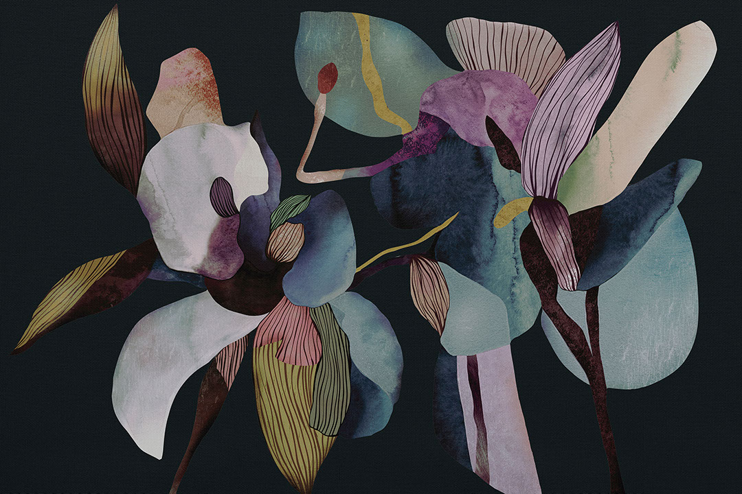 Noctiora stabilisce un tono drammatico grazie alla fusione di fiori ad acquerello intensi con uno sfondo scuro profondo. Il murale appare moderno e raffinato, aggiungendo un senso di intimità elegante. È ideale come parete d’accento in soggiorni, camere da letto e spazi creativi. I blu profondi, i bordeaux e i viola creano un’atmosfera artistica. Noctiora si abbina magnificamente a dettagli metallici, legni scuri e illuminazione calda. Negli ambienti ampi dona una sofisticazione da galleria. È perfetto per chi ama un’estetica moderna e audace.
