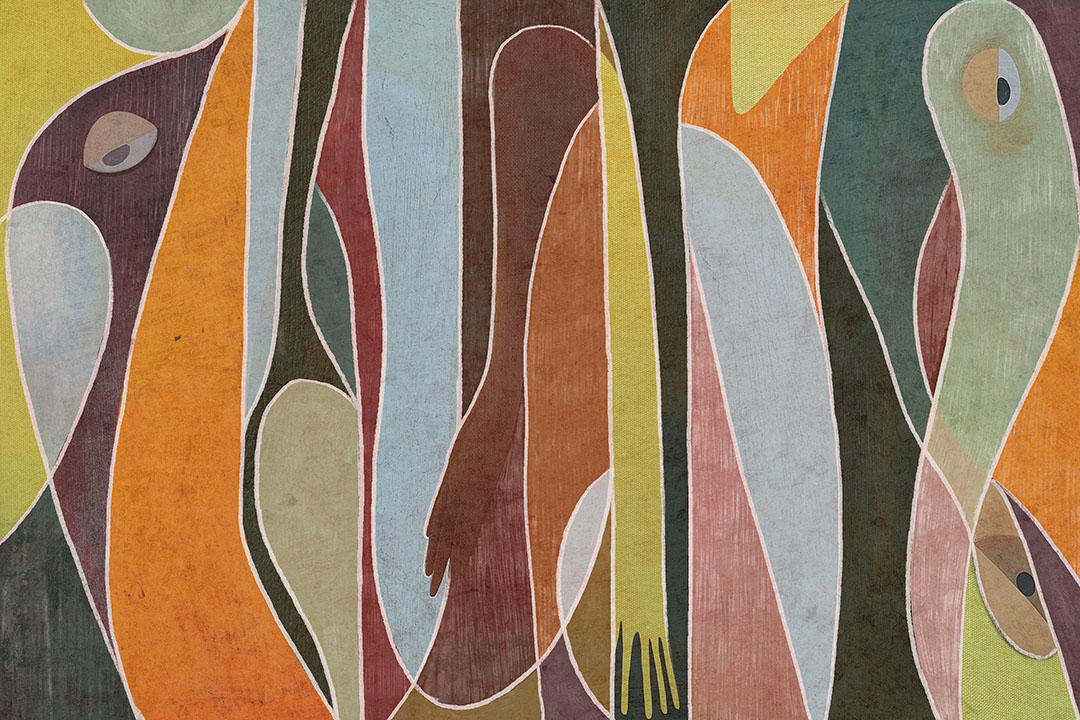 Carta da parati con figure astratte allungate in tonalità terrose calde