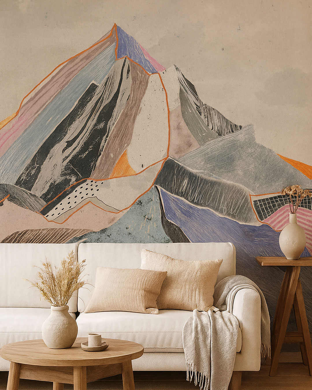 La carta da parati Montela raffigura una vetta montana costruita da campiture di colore, tratti e linee nelle sfumature del rosa, dell’azzurro, della terra d’argilla e del grigio morbido. Il disegno ricorda un mix tra acquerello e matita colorata e trasmette un’atmosfera leggera e creativa. Questo soggetto funziona molto bene in una cameretta, in uno studio o in un atelier dove si desidera favorire un clima sognante e ispirante. La palette pastello mantiene lo spazio rilassato e si abbina facilmente a mobili chiari, legno naturale e tessuti semplici. Negli interni moderni, scandinavi o eclettici, Montela introduce un punto focale grafico senza risultare troppo deciso. In coworking, uffici creativi o caffè la carta da parati richiama con discrezione l’idea di nuove vette da raggiungere e di scelte coraggiose. È un modo gentile per portare il tema della montagna in un ambiente urbano.